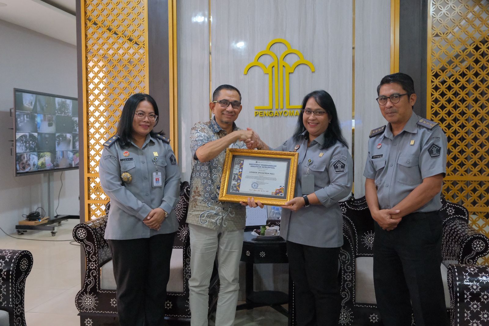 Bertempat di ruang kerjanya, Kakanwil Kemenkum NTB, I Gusti Putu Milawati didampingi Kepala Divisi Pelayanan Hukum dan Kepala Bidang Pelayanan Kekayaan Intelektual menyerahkan sertifikat kepada General Manager Lombok Epicentrum Mall dan Manager Operational Niaga Supermarket Plus.