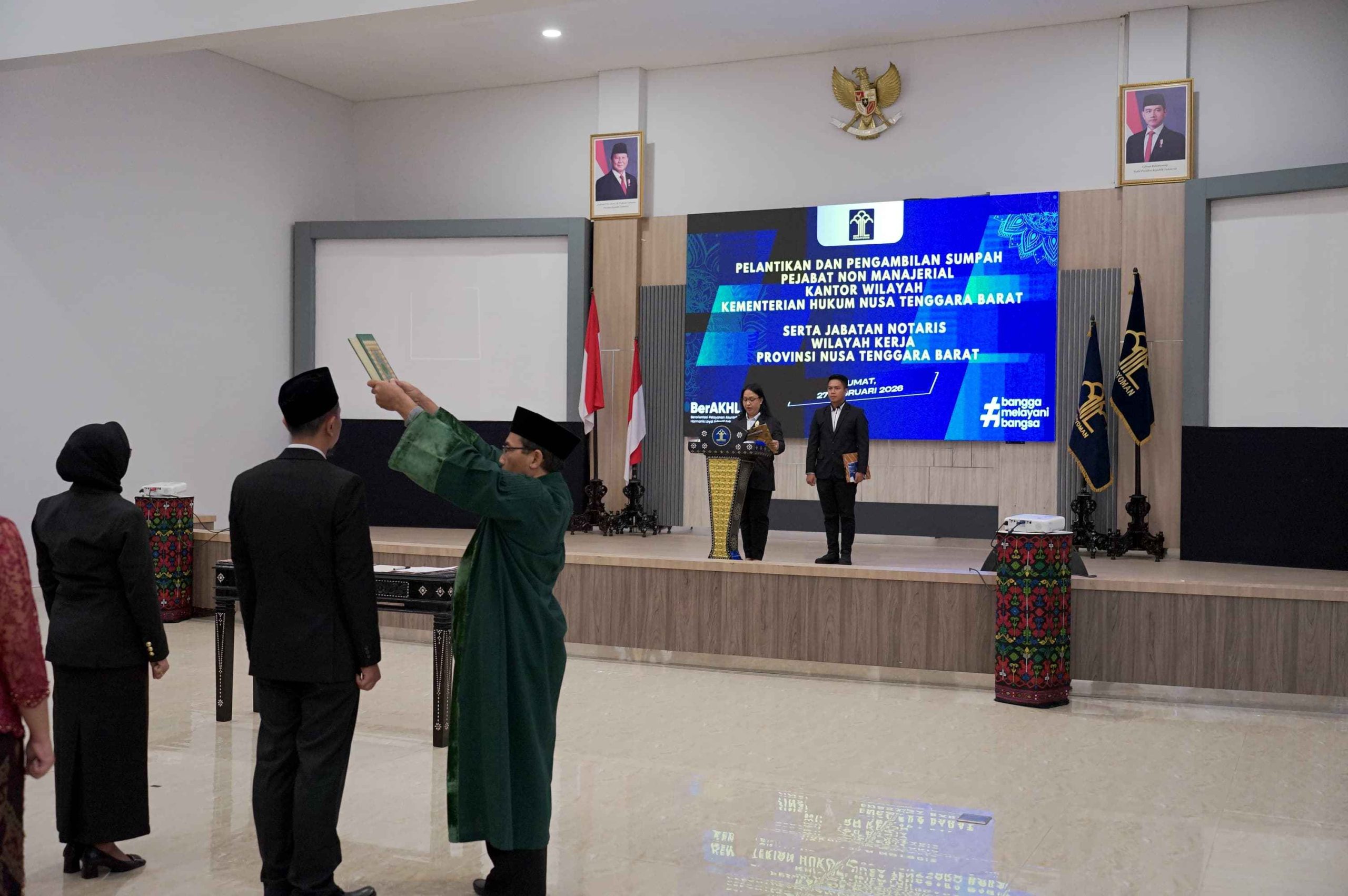 Mataram – Kepala Kantor Wilayah Kementerian Hukum Nusa Tenggara Barat (Kanwil Kemenkum NTB), I Gusti Putu Milawati, melantik dan mengambil sumpah 2 pejabat nonmanajerial di lingkungan Kanwil Kemenkum NTB, Jumat, (27/2).