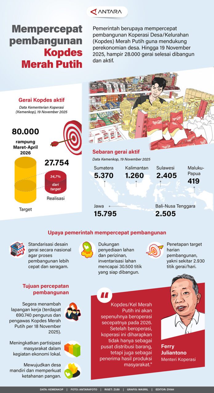 Pemerintah berupaya mempercepat pembangunan Koperasi Desa/Kelurahan (Kopdes) Merah Putih guna mendukung perekonomian desa. Hingga 19 November 2025, sebanyak hampir 28.000 gerai selesai dibangun dan aktif.