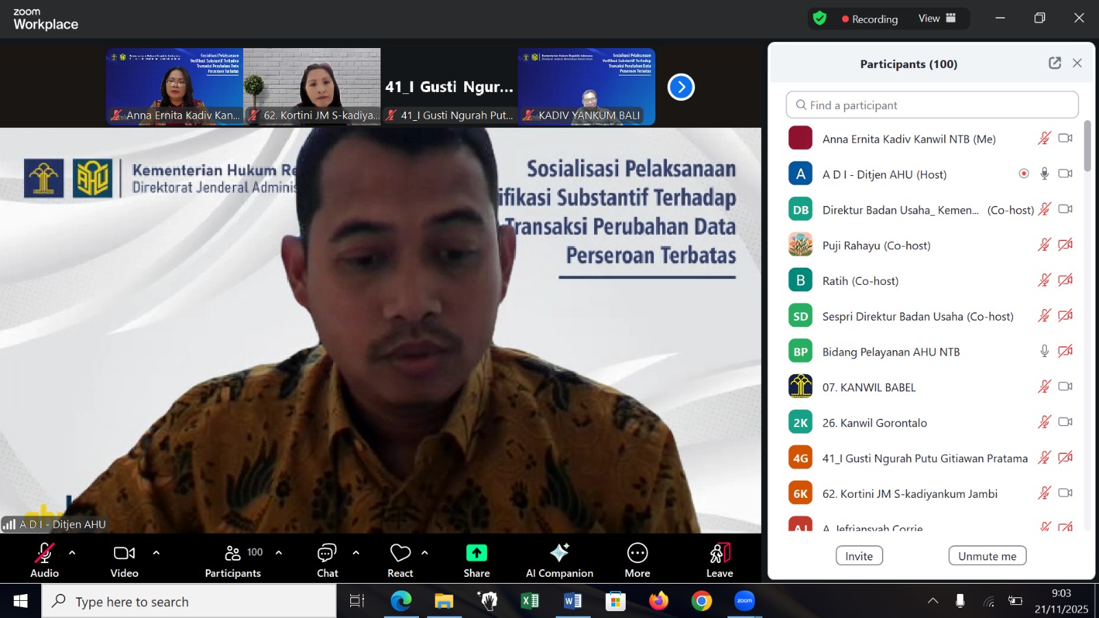 Mataram – Kantor Wilayah Kementerian Hukum Nusa Tenggara Barat (Kanwil Kemenkum NTB) mengikuti kegiatan Sosialisasi Pelaksanaan Verifikasi Substantif terhadap Transaksi Perubahan Data Perseroan Terbatas yang diselenggarakan oleh Direktorat Jenderal Administrasi Hukum Umum (Ditjen AHU) pada Jumat (21/11). Kegiatan ini dilakukan secara virtual melalui Zoom Meeting dan diikuti oleh Kepala Divisi Pelayanan Hukum, Anna Ernita, Kepala Bidang Pelayanan Administrasi Hukum Umum, Puri Adriatik Chasanova, serta jajaran Pelaksana Bidang AHU.