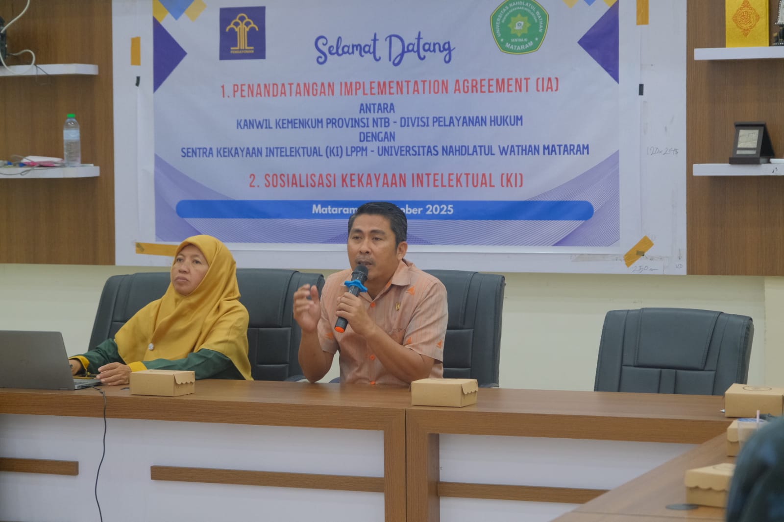 Mataram – Kantor Wilayah Kementerian Hukum Nusa Tenggara Barat (Kanwil Kemenkum NTB) melalui Bidang Pelayanan Kekayaan Intelektual (KI) menyelenggarakan sosialisasi KI yang ditujukan kepada dosen dan mahasiswa di lingkungan Universitas Nahdlatul Wathan (UNW) Mataram, Kamis (9/10). Kegiatan ini bertujuan untuk meningkatkan kesadaran dan pemahaman tentang pentingnya KI dalam pelindungan dan pemanfaatan hasil karya dan inovasi.