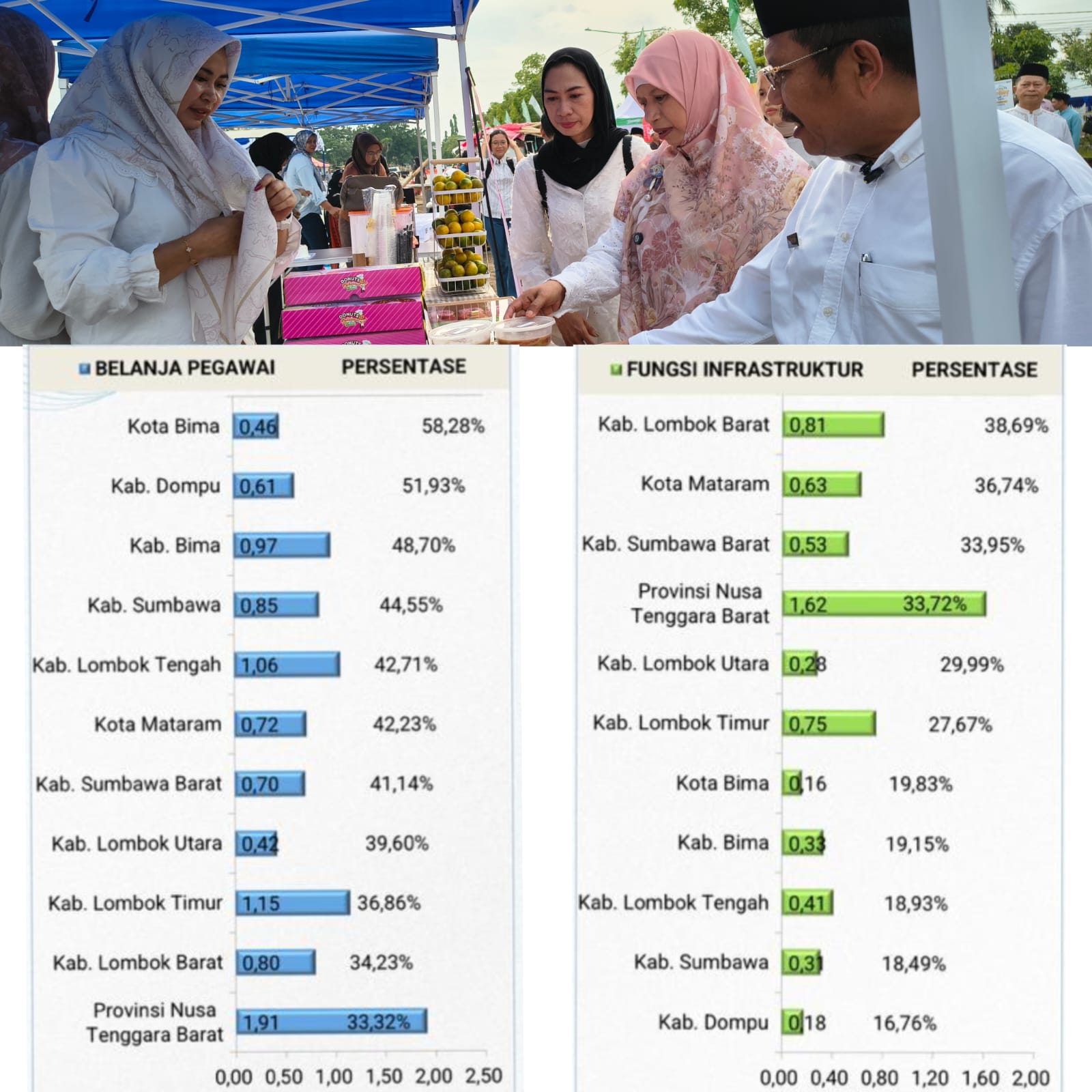 Data visual menunjukkan fungsi infrastruktur di Lombok Barat mencapai angka 38,69 persen. Angka ini melampaui rata-rata Provinsi NTB yang berada di angka 33,72 perseb, serta jauh mengungguli daerah lain seperti Kota Mataram dengan 36,74 persen dan Kabupaten Sumbawa Barat 33,95 persen. Tingginya angka ini mencerminkan keberanian Pemda mengalokasikan sumber daya untuk perbaikan jalan, fasilitas kesehatan, dan sarana publik lainnya.